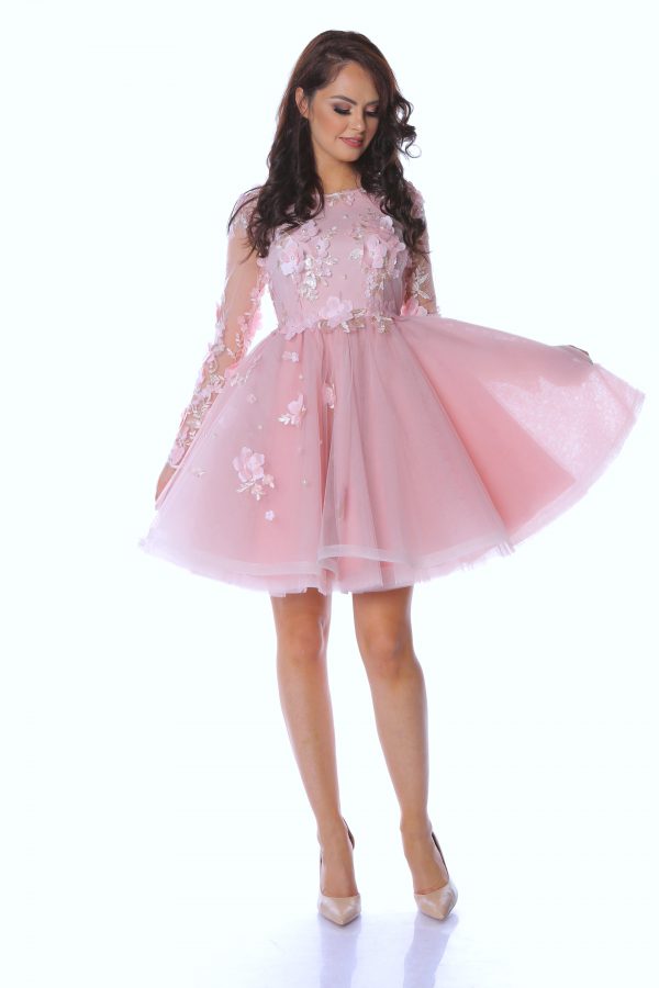 Rochie damă Powder Pink Dress confecționată din broderie 3D, tul clasic, satin de mătase și jumătăți de perle, cu fermoar ascuns la spate.