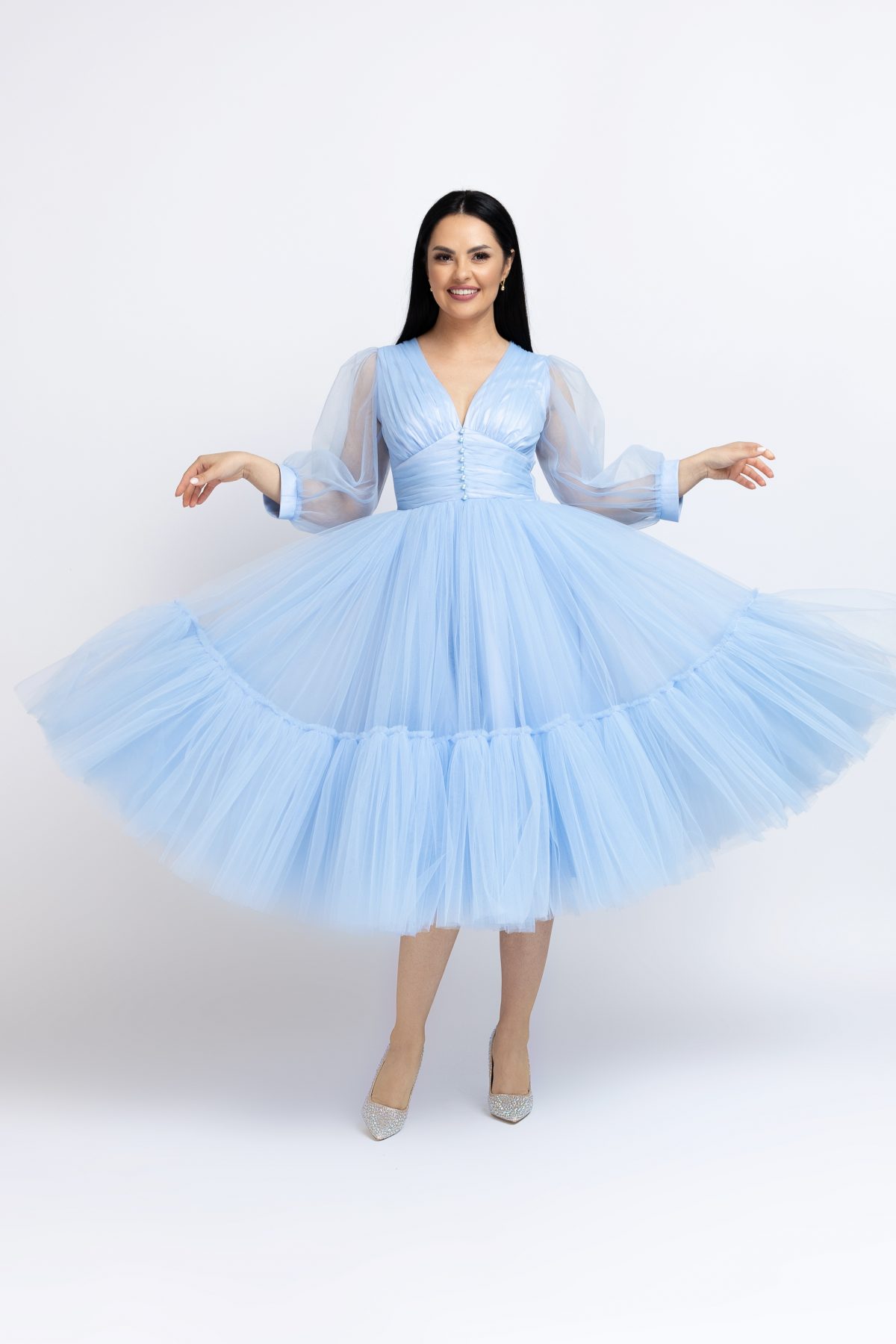Rochie damă Blue Midi Dress confecționată din tul soft, satin de matase aplicații decorative.