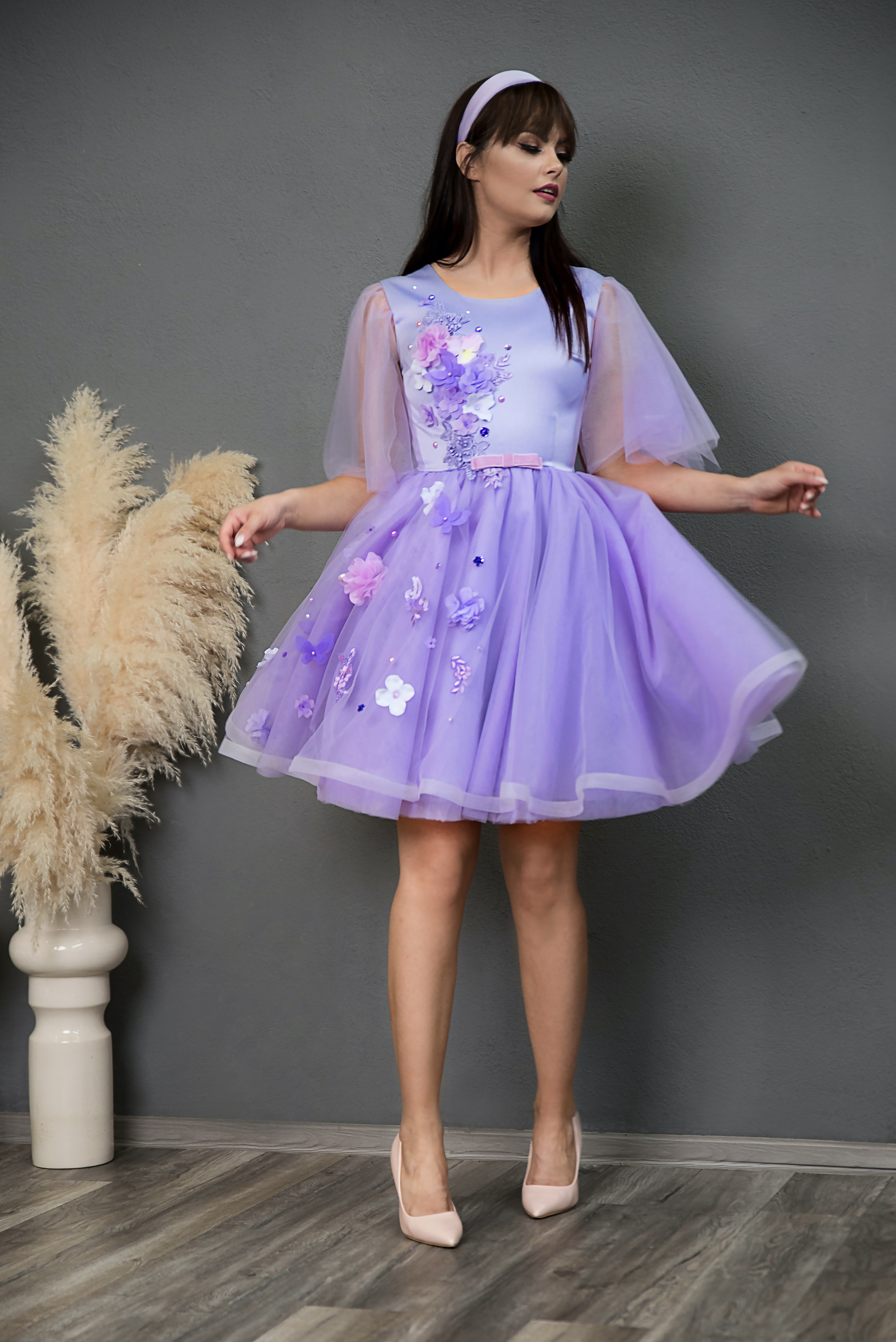 Rochie damă Lavender Dress confecționată din tafta elastică, tul fin cu conținut de mătase și aplicații din mărgele, jumătăți de perle și flori textile, cu fermoar ascuns la spate.