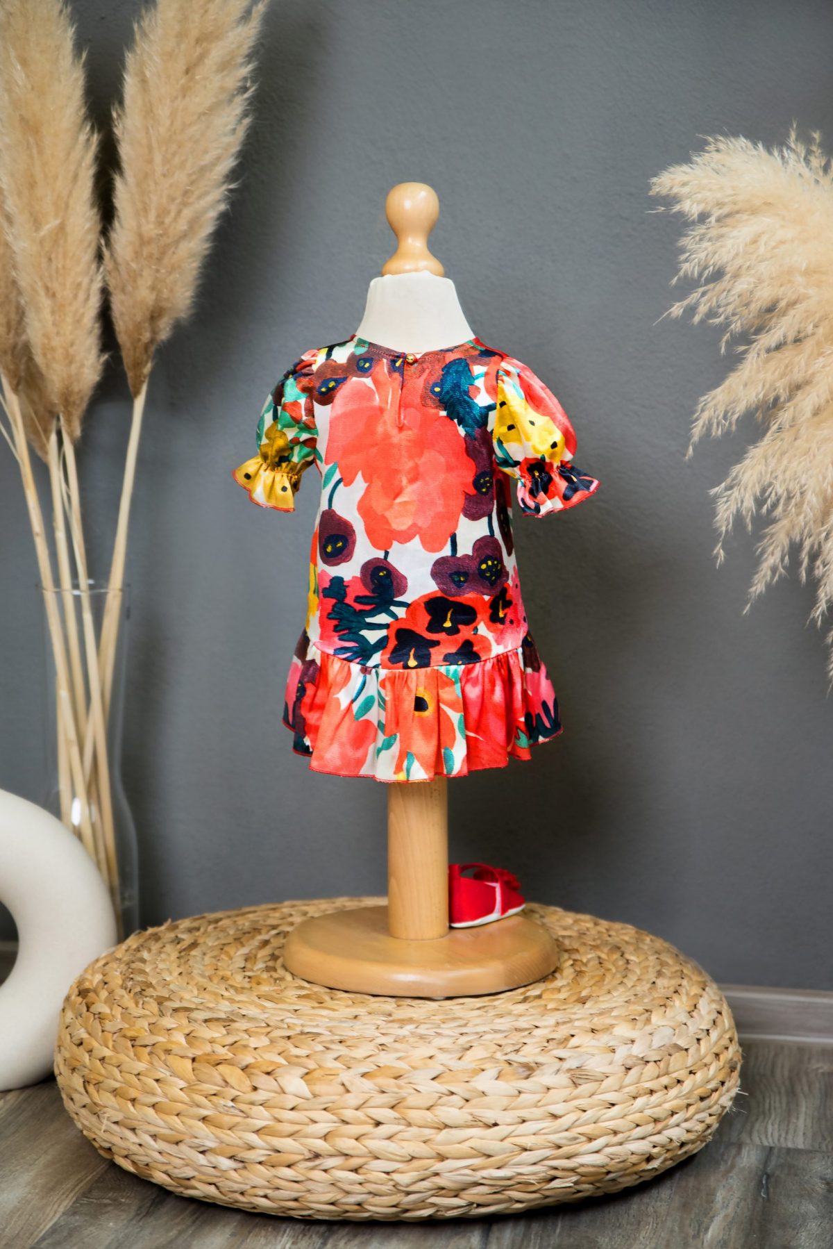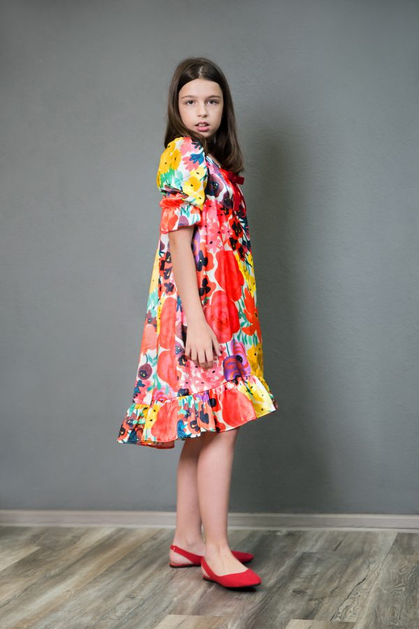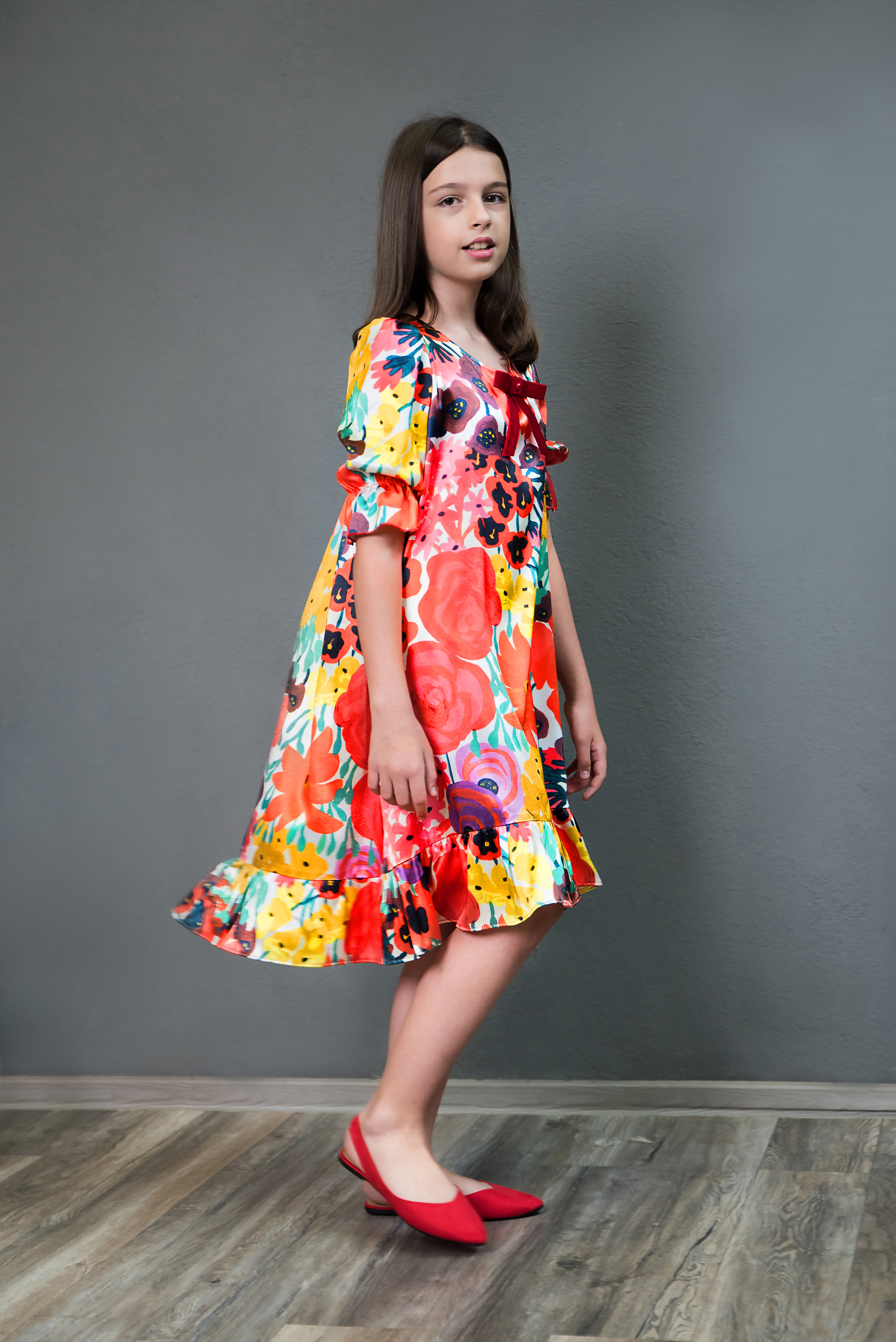 Rochie fetiță Poppy Dress confecționată din jacquard, accesorizată cu fundiță din catifea roșie. Modelul poartă mărimea 146 cm – 11 ani.