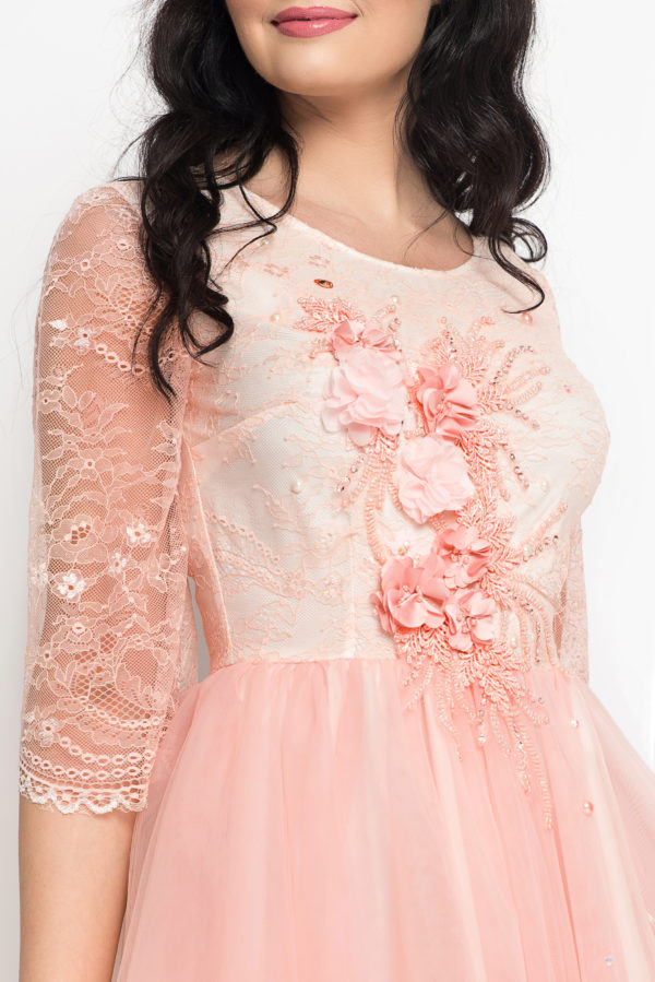 Set rochii mamă-fiică Peach Ivory confecționate din dantelă fină, tul cu conținut de mătase, aplicații din mărgele, jumătăți de perle și flori textile, căptușită cu satin de mătase și fermoar ascuns la spate.
