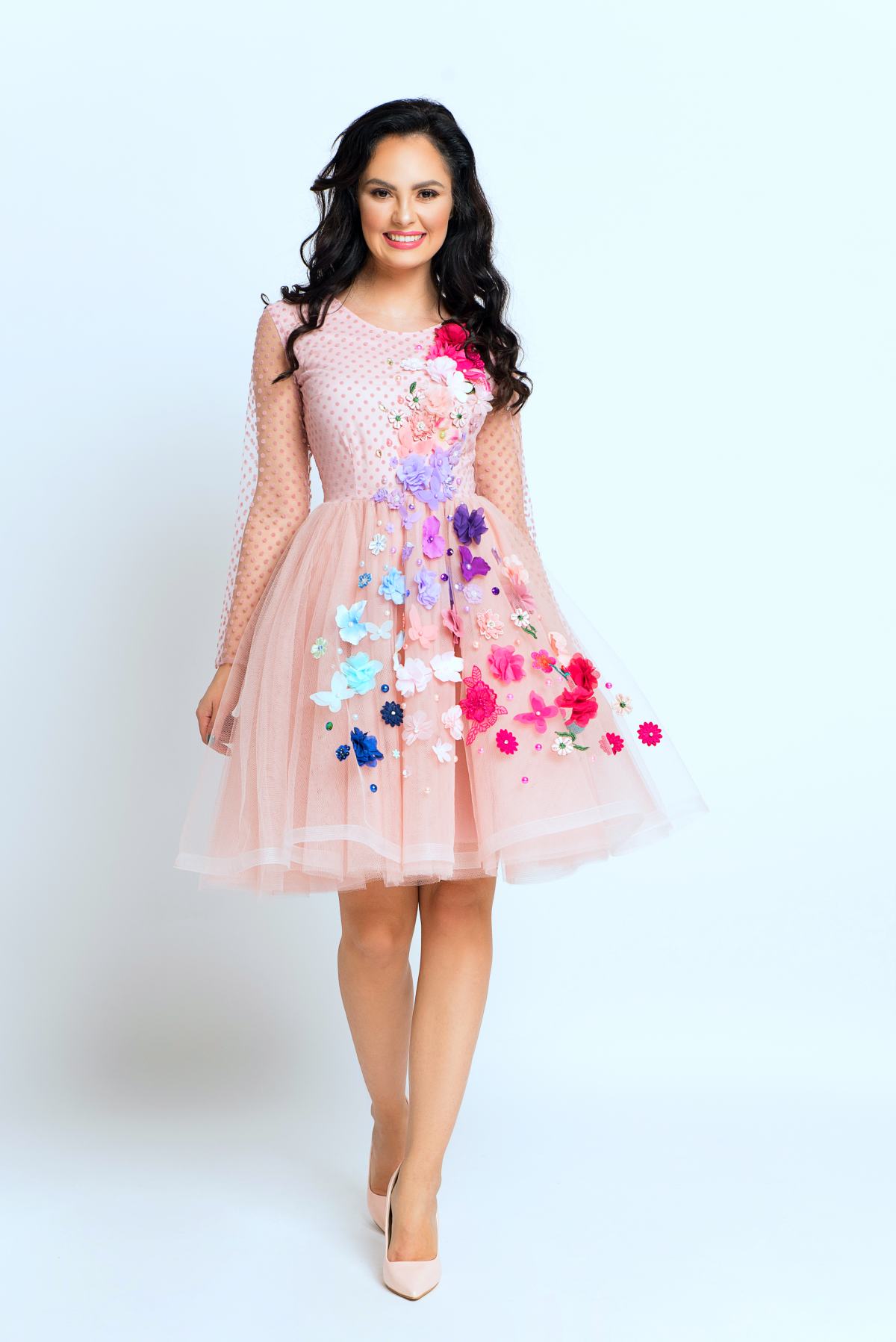 Set rochii mamă-fiică Powder Pink Dots & Flowers confecționate din tul cu buline, tul clasic, aplicații din mărgele, jumătăți de perle și flori textile, căptușite cu satin de mătase și fermoar ascuns la spate.