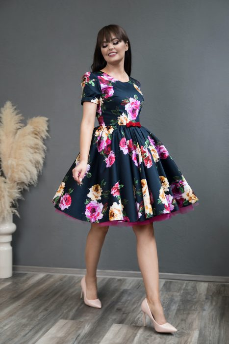 Rochii mama fiica Navy Rose Dress confecționate din bumbac satinat cu fir de matase, tul, satin de mătase, fermoar ascuns la spate. Rochiile sunt accesorizate cu funde detașabile din satin.