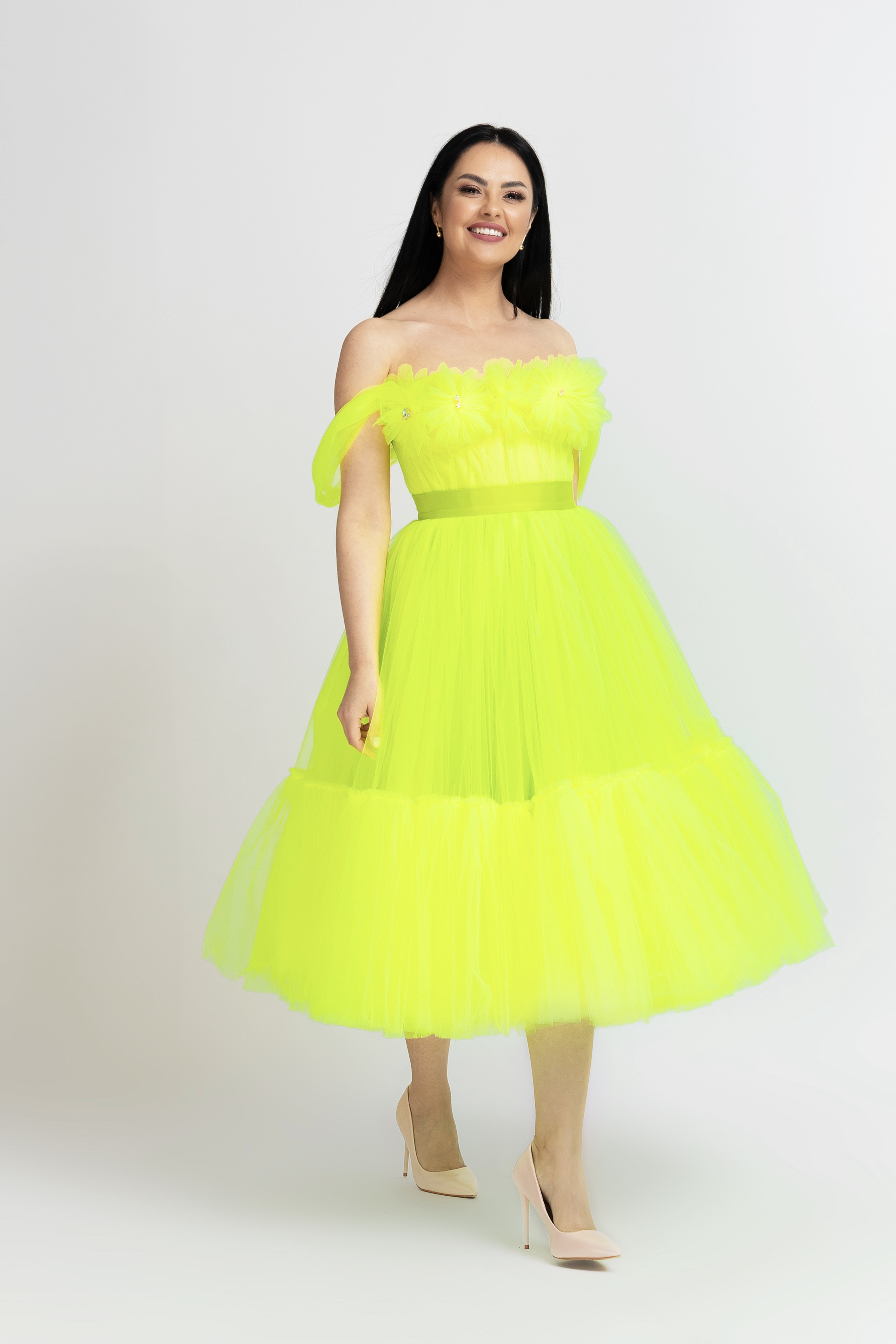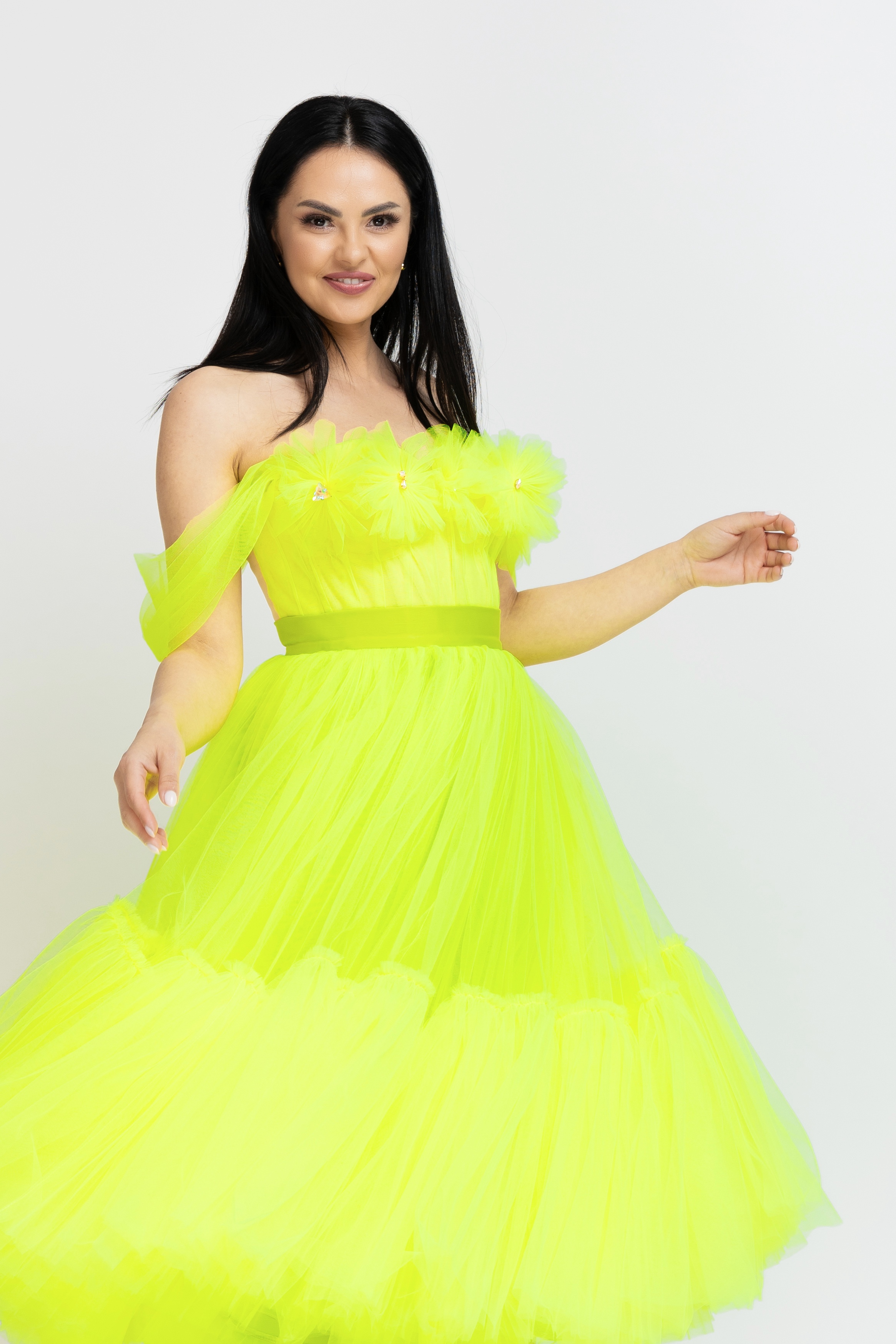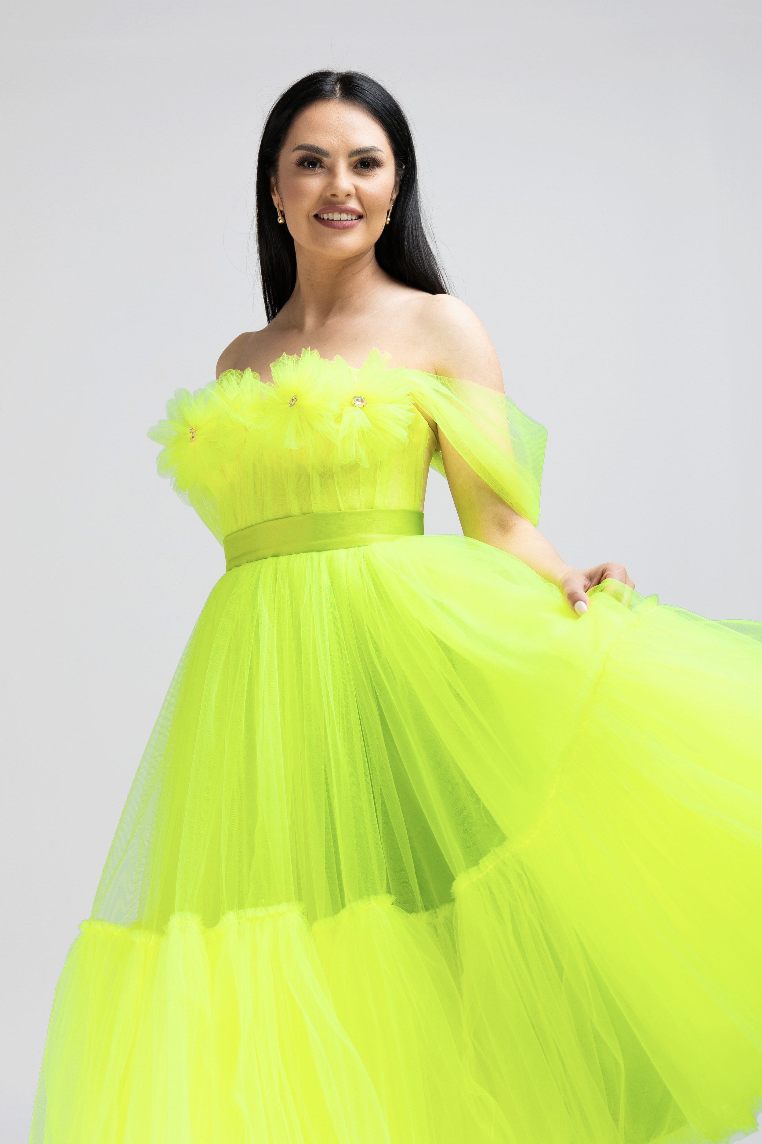 Rochiile sunt compuse din corset din tafta imbracat în tul soft și aplicații cu cristale de sticlă și fustă confecționată din tul soft și satin de mătase.