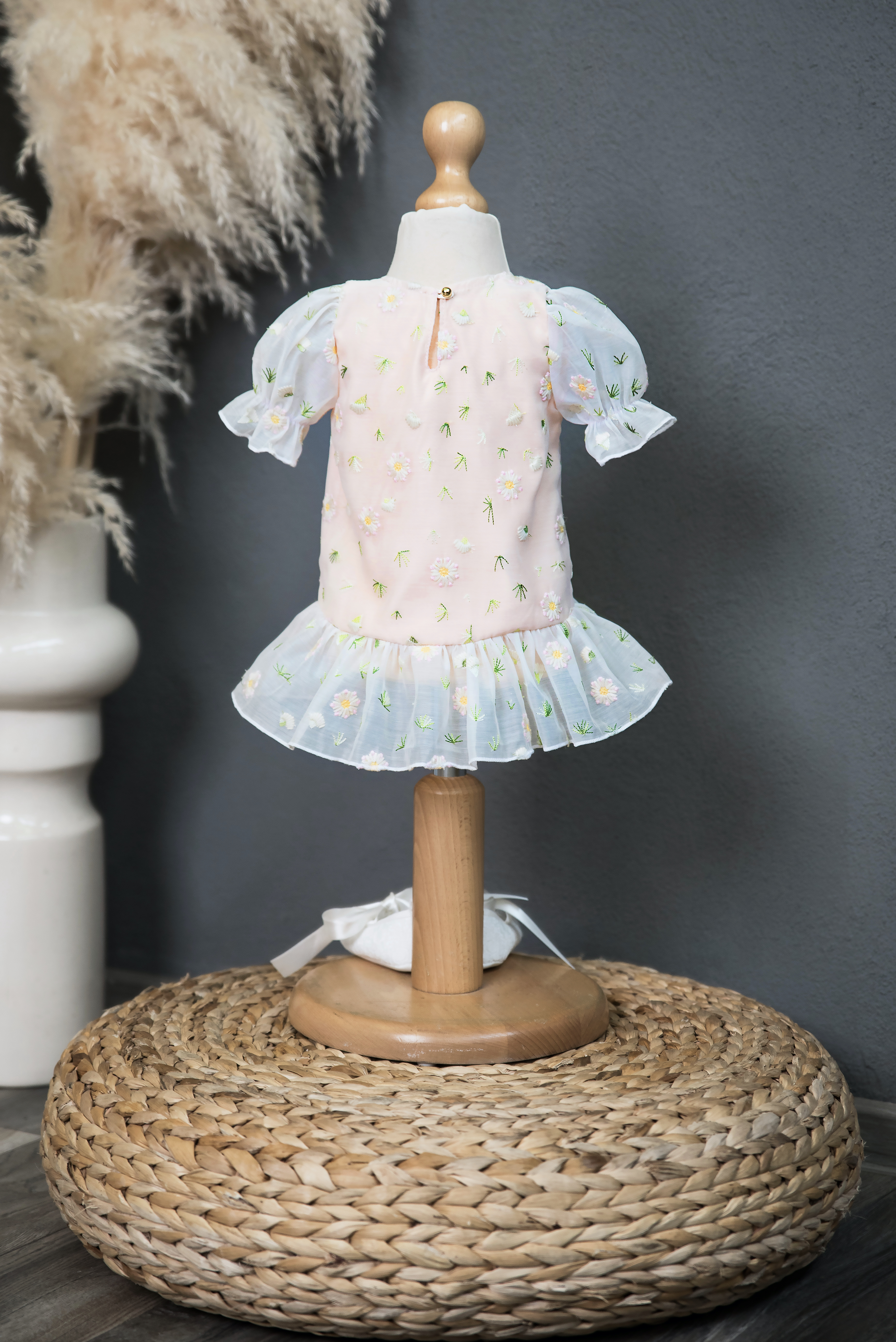 Setul conține: rochie botez, bentiță, botoșei, lumânare, cutie ovală (cufăr), trusou biserică – crișmă brodată, fașă, prosop baie bebe, prosop preot, săpun, sticlă mir și cutie accesorizată în ton cu rochia.